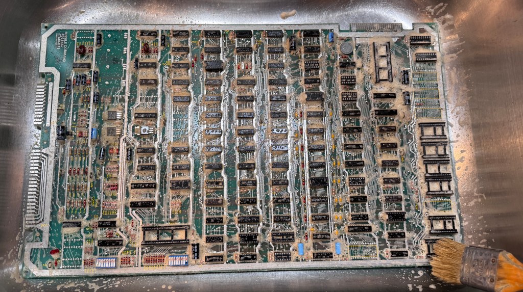 I decided to connect to my tester first and check RAM/ROM.. Every other ROM tested and none of the RAM tested when I got started. I poked around a bit looking for a cause – but the board was really dirty and many times putting a ROM in would make one work and another would stop.. The board got washed. I use Krud Kutter to wash the boards. I use a finger brush on the back and a soft bristle paint brush on the front. I find the cleaner gets into the sockets and gets everything off the metal. The stuff is amazing and just melts the grime off.