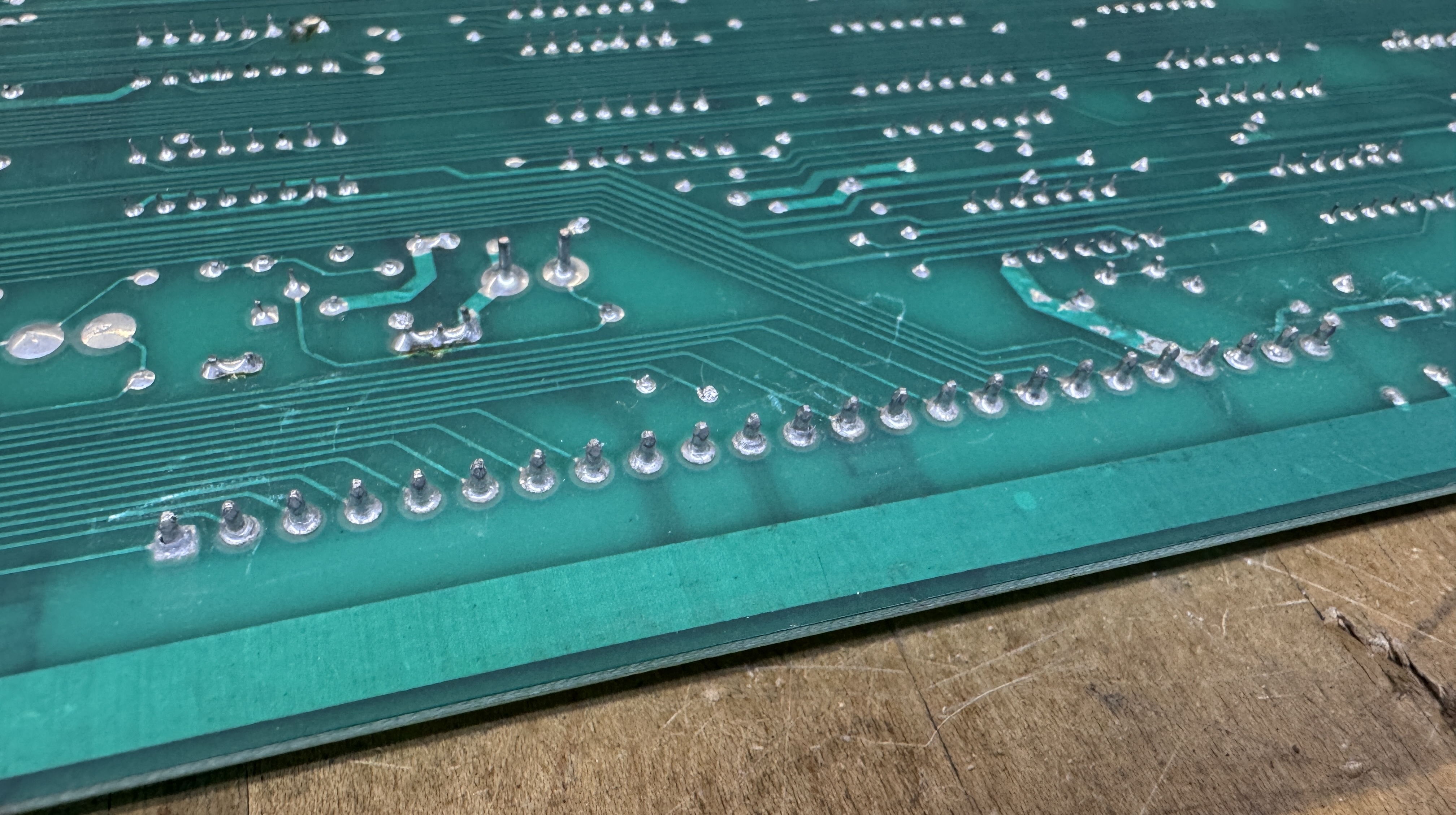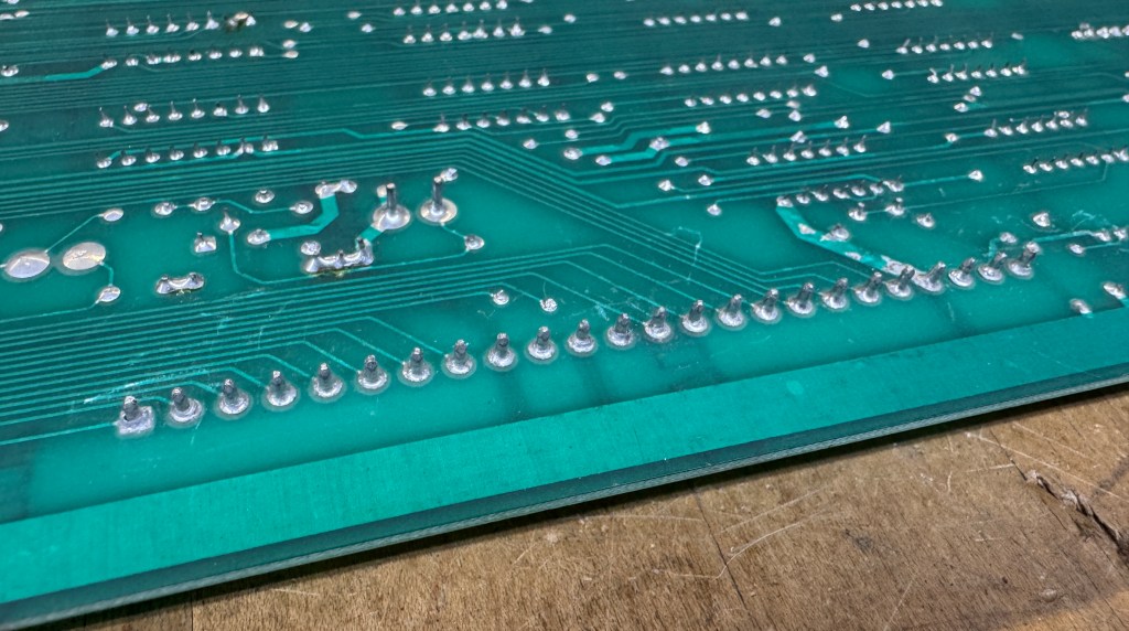 - The fingers on the PCB card edge had all been flowed with solder to ‘thicken’ them it seems. I’m guessing it came from a cabinet that had a loose edge connector. I removed the solder and the fingers below were perfect.