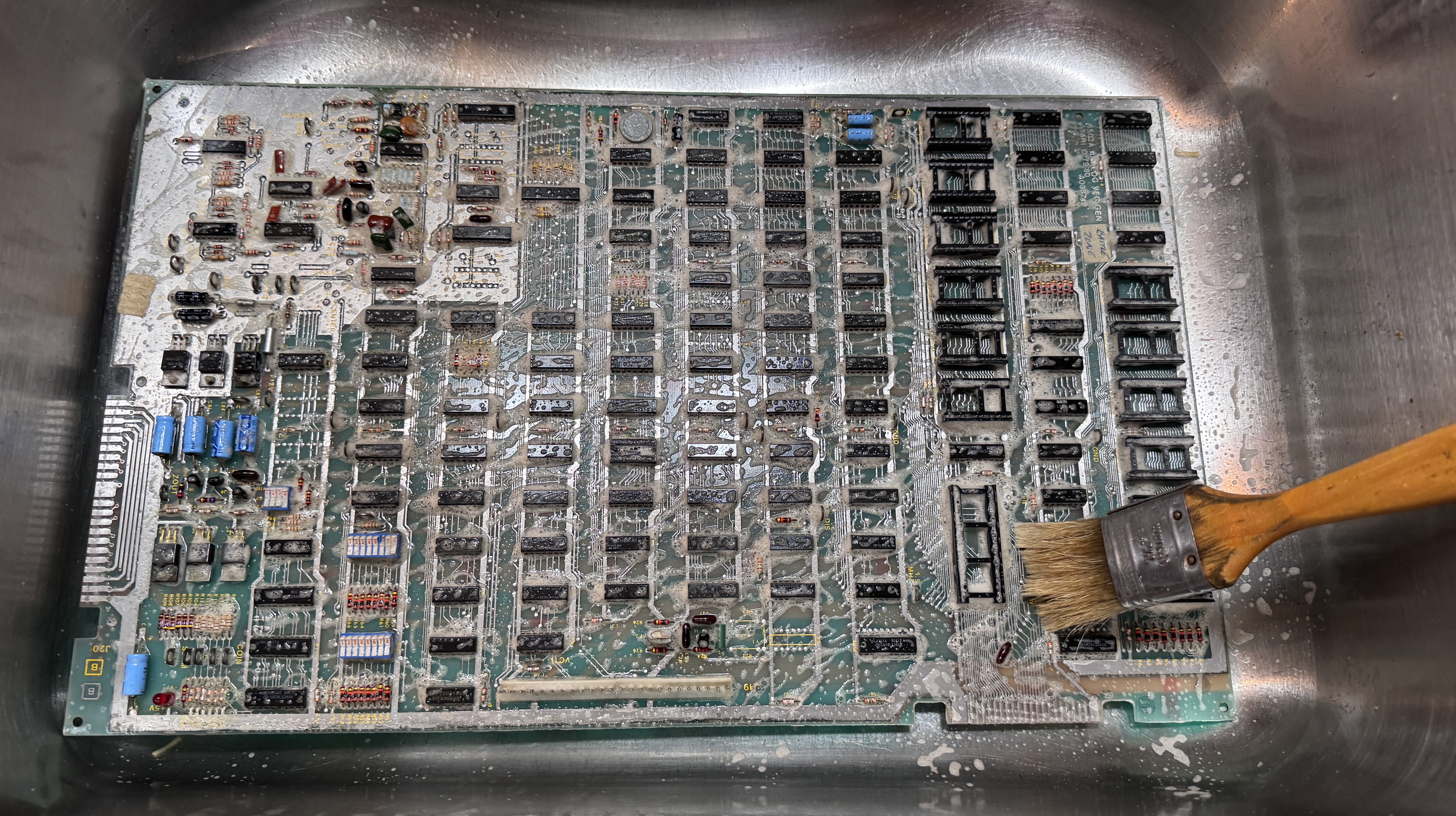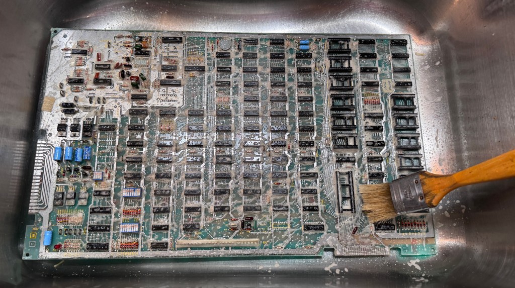 There were some cold solder joints at the header pins. I wire wheel them to shine them up and reflow. I also did my standard board maintenance removing all the chips (which were clean) .. buffed up the legs and Deoxit them and the sockets, then connected it up to the test harness.