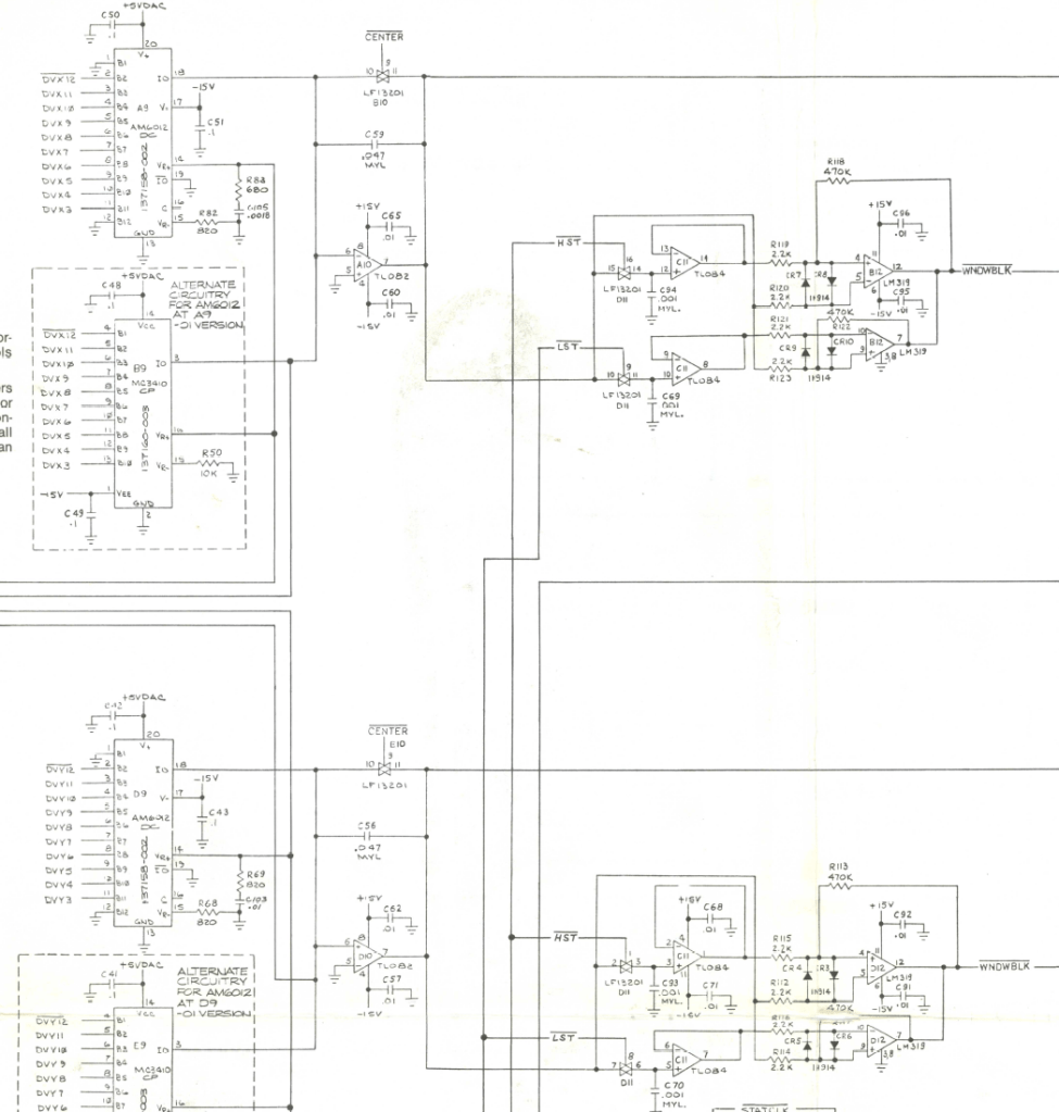 I’ve gone through all the IC’s in the analog section at this point and started swapping out capacitors. I’ve worked on this for a while and have not been able to isolate this issue. It appears to be analog in nature. One unique item (I think) is that the distortion is at one end of the vector. Even vectors that change length such as the rolling letters or the geometric shapes that move in out, the length of the distortion stays the same even though the vector gets shorter. I figured I messed something up during ‘the incident’.. I’ve checked lots of things, replaced all of the .1 and .01uf caps that surrounded the -15v chips (and some others).. No joy.