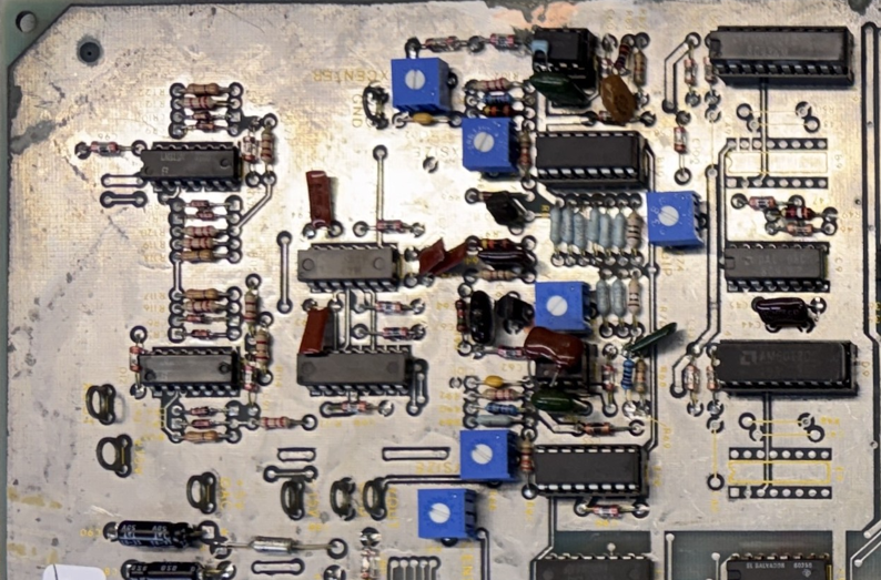 Look real close – pin 14’s address line had been cut at some point. Repaired with a small Kynar wire locked in place with UV cured resin. There was also a cut trace/repair with a jumper on the AUX board. I removed the wire and repaired the same way.