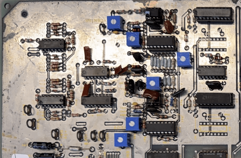 Here they are all removed and prior to a little cleanup before installing new sockets. Nine in total including the CPU. Takes a while to get though them all. As with nearly all the vectors, I replace the stand up pots that are easily broken with sealed cermet pots.