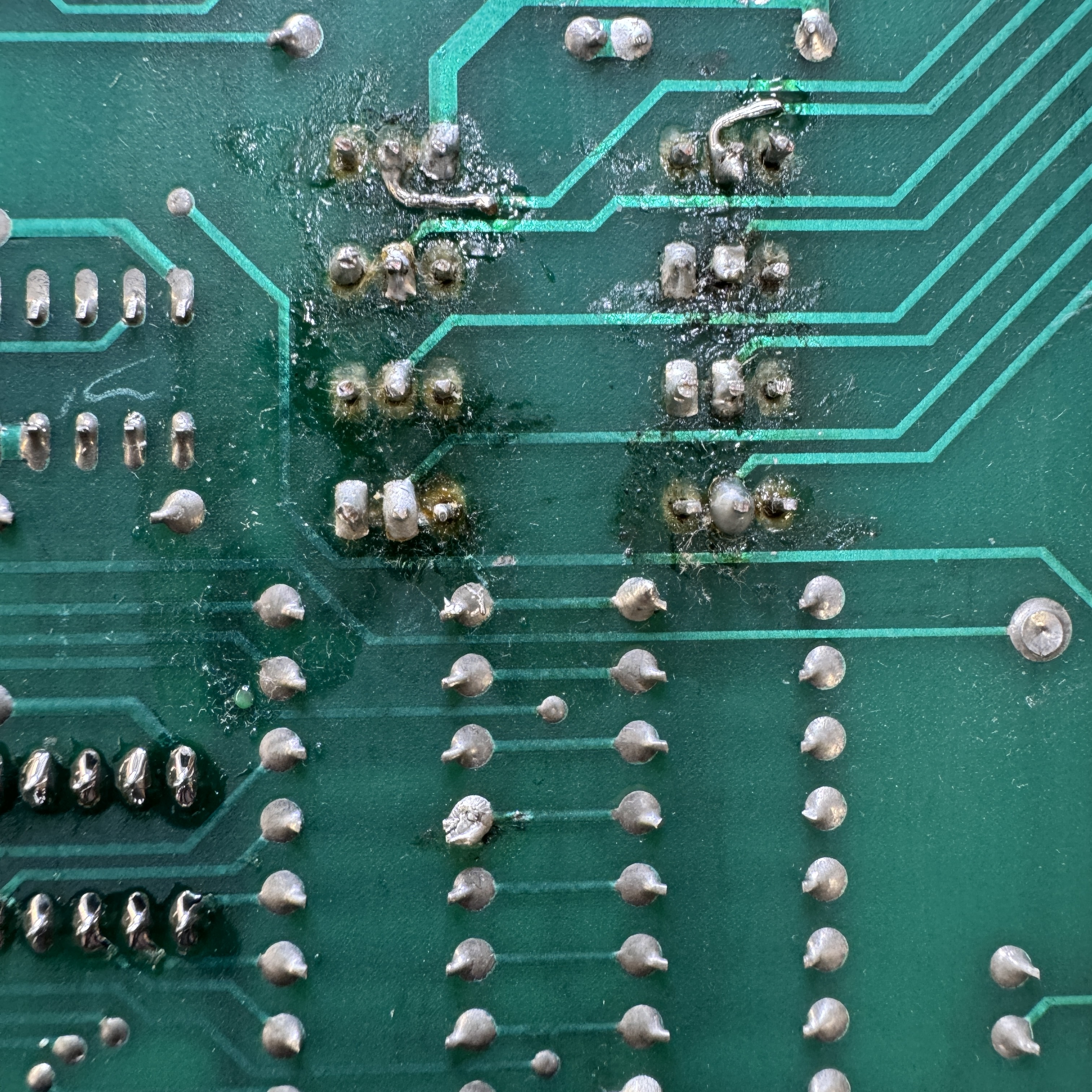 Here is the mess on the solder side and me removing all of the transistors on the parts side. The traces were pulled up and just missing.