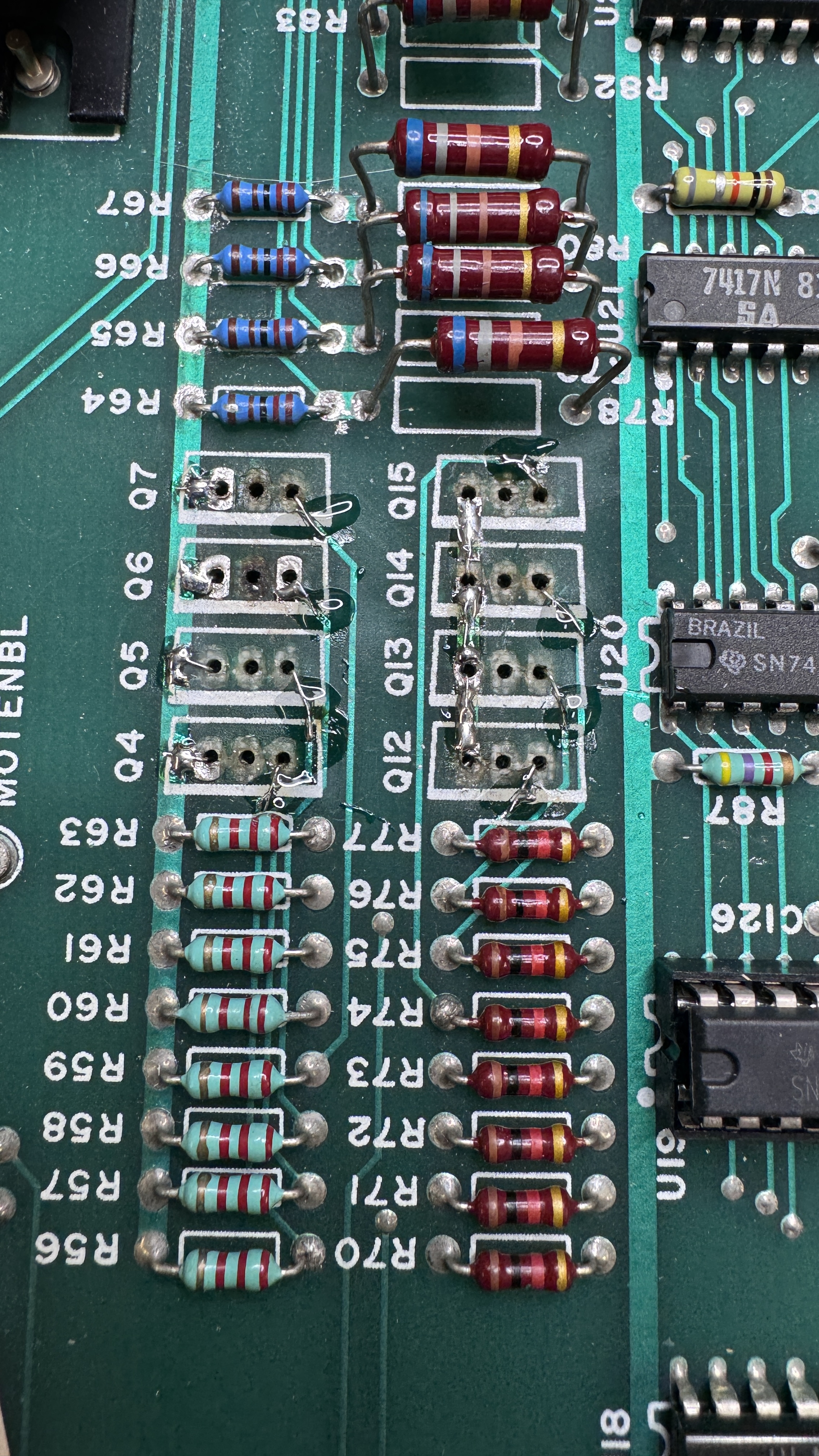 After getting all of them out and beginning to sort out what repairs were needed – I did not want to directly solder the transistors back in place. If one ever failed – it would have ruined the repair. It took some searching but I found transistor sockets (see Q19) that would work. I could repair the traces and use sockets. This took a few hours to get all back to gether.