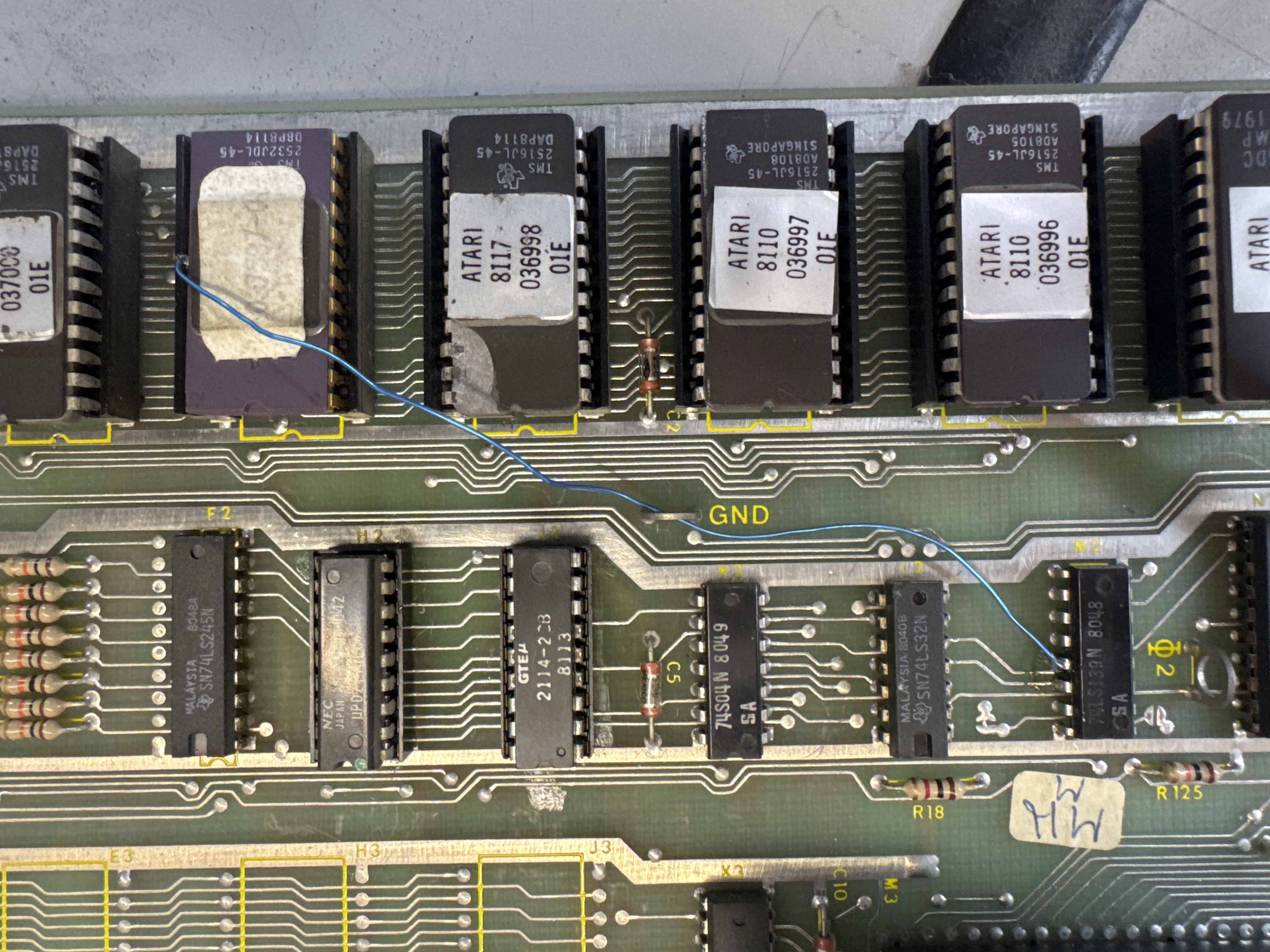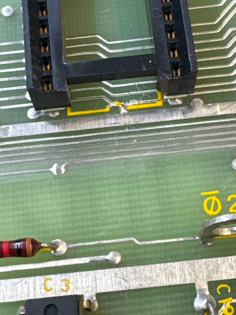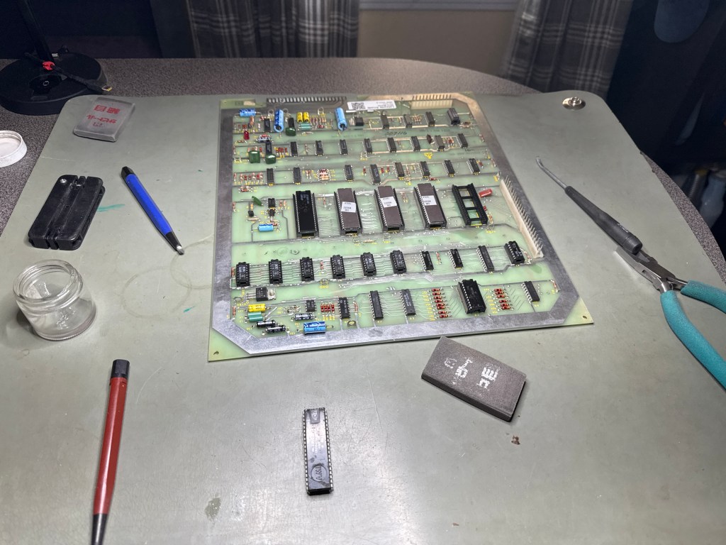 Cold solder joints on the interconnect, the edge connector was really chewed up and the chip legs were all pretty dirty/oxidized. I worked through the stack and corrected these. Board started working. I haven’t done much with it until I pulled it out to use as a reference for Board #2 below. While using it – the EPROM 036999 failed and corrupted the EPROM bus on the right side. I had to stop and figure that out. It has bad EPROM sockets too, had to reseat a few times, but that is a future me problem.